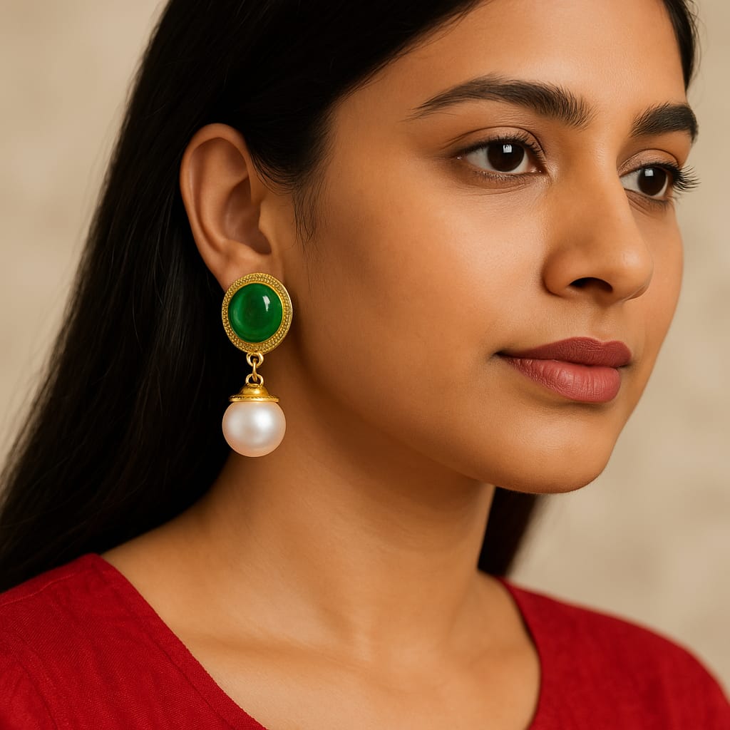 Add timeless elegance to your collection with these exquisite gold-plated drop earrings. Featuring a rich green round stone at the top and a lustrous pearl drop, this design blends traditional charm with modern sophistication. Perfect for festive occasions, weddings, or evening outings, these earrings bring a graceful touch to any outfit. Lightweight and versatile, they are designed for all-day comfort while enhancing your style effortlessly.